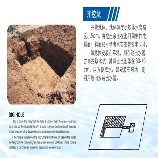 根據(jù)現(xiàn)場的環(huán)境選擇合適的場地,清除雜物,按安裝規(guī)格選址放線,放線尺寸比安裝水窖尺寸小5cm。